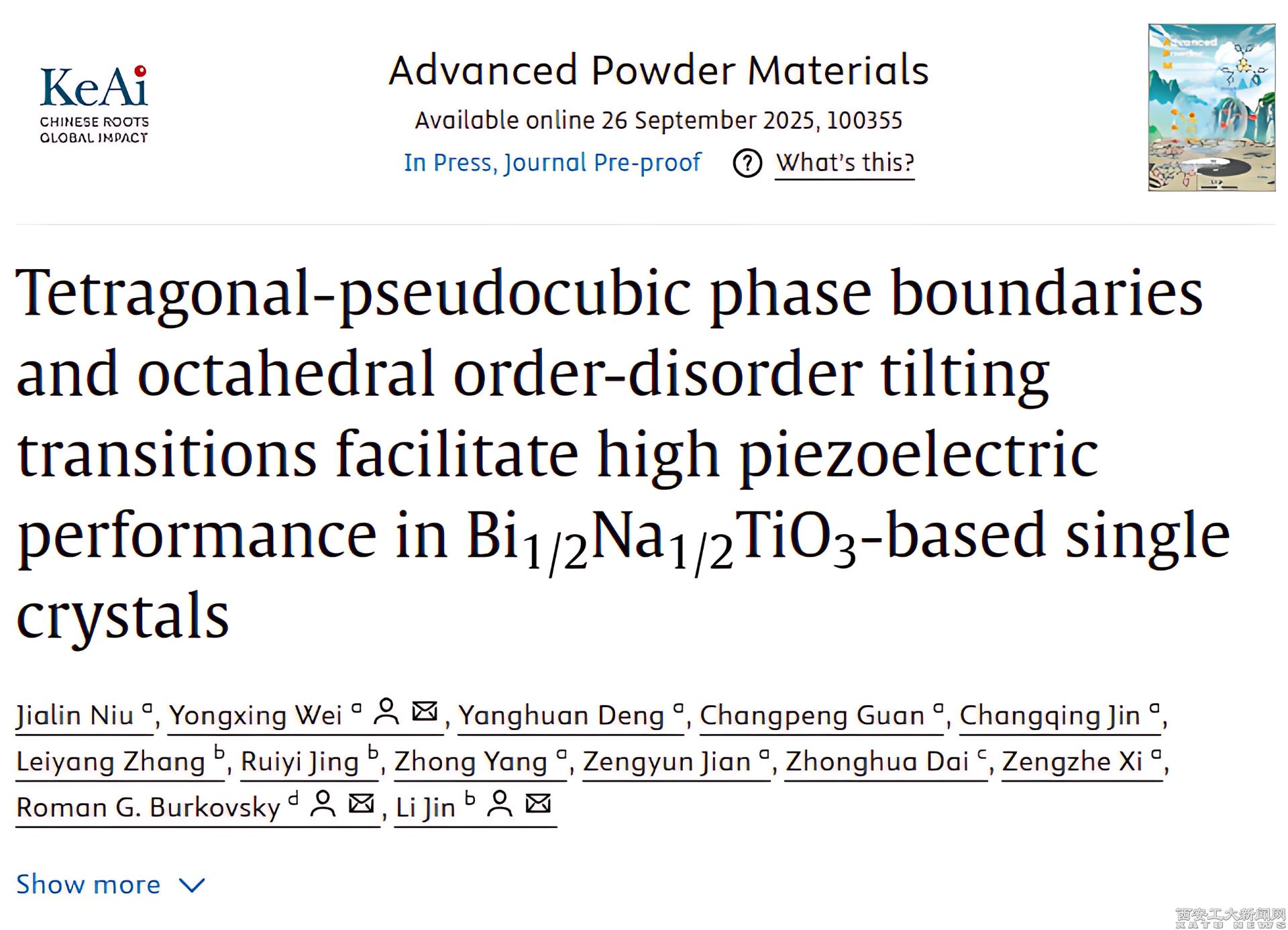 (本网讯)近日,米兰online(中国)材料与化工学院魏永星副教授研究团队联合西安交通大学靳立教授、俄罗斯圣彼得堡彼得大帝理工大学Roman G. Burkovsky副教授在国际顶级学术期刊《Advanced Powder Materials》(IF=24.9)上发表了题为“Tetragonal-pseudocubic phase boundaries and octahedral order-disorder tilting transitions facilitate high piezoelectric performance in Bi1/2Na1/2TiO3-based single crystals”学术论文,米兰online(中国)为第一通讯单位,2024级博士研究生牛佳林为论文的第一作者。